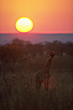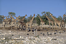 Beim weltweit höchsten Landsäugetier erübrigt sich fast jegliche Beschreibung. Der extrem lange Hals der Giraffe (Giraffa camelopardalis) hat wie der Hals aller anderen Wirbeltiere nur sieben, allerdings besonders lange Wirbel. Sie kann bis zu 5,60 m hoch werden, wobei die Kühe kleiner sind. Giraffen werden ungefähr 20 Jahre alt und leben in Herden mit relativ lockerer Sozialstruktur.